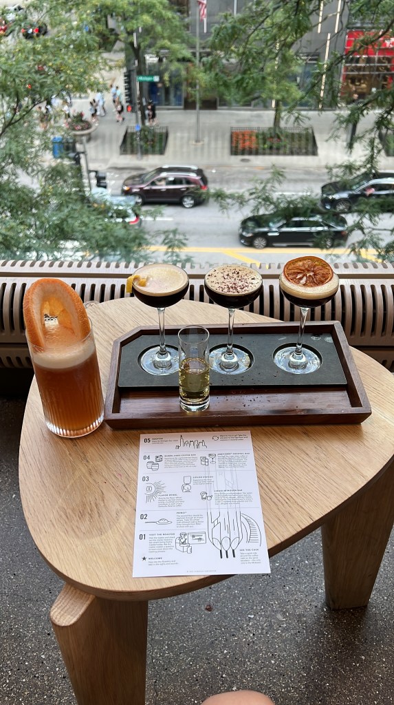 The Espresso Martini Flight give you three different Starbucks Reserve® Espresso Martinis fused with global liqueurs: Orange Cacao, Molé Spice and Cherry Limone. The Roastery Boilermaker is a Chicago location exclusive and has Starbucks Reserve® Cold Brew, Koval Four Grain Whiskey, Malört, Combier Pamplemousse, Honey Syrup, Fever Tree Club Soda, Bittermens Hopped Grapefruit Bitters, Pink Grapefruit Juice, Lemon Juice, Grapefruit Wheel, Salt Tincture, Rhine Hall Bierschnaps.