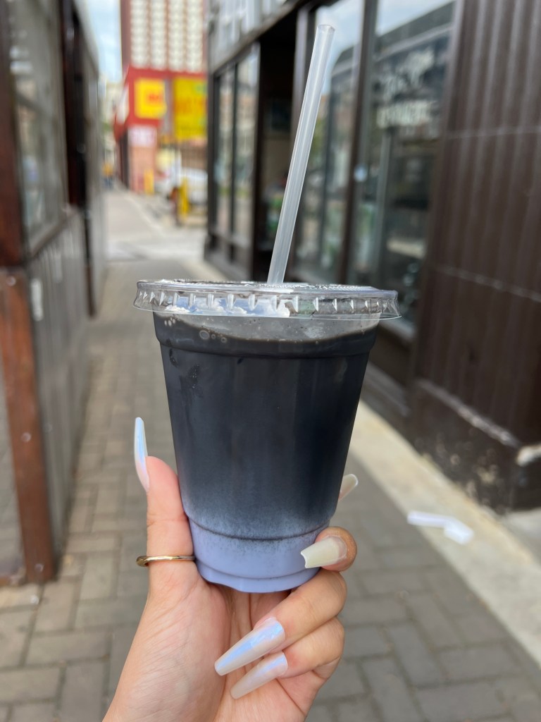 On the way back to our cars, we quickly stopped in First Sip Cafe and ordered the Ubae Nior Latte. It was such a cute decorated cafe with black walls covered in plants and lights. Then around the register there’s a bunch of different teacups hung up and gave it a very dainty feel. I thought that was super cute. The picture may not look as appealing, but it was a really good drink. I would order it again! It’s a black tea with activated charcoal latte, sweetened with Ube or sweet purple yam.