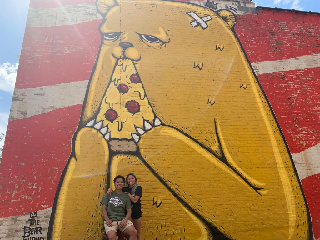 A little fun fact about the Wicker Park location of Parlor Pizza, on the side of the building they have this mural of a bear eating pizza! I think it’s so cool. Here’s a picture of us from 2019. We didn’t eat there that day, but said we would come back to try it and we finally did!