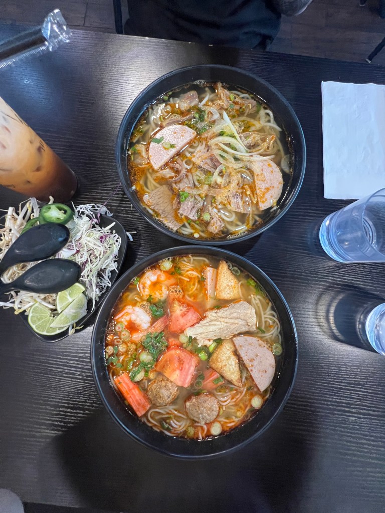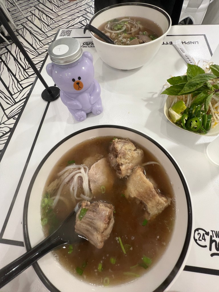 I’ve been following Gao Viet Kitchen for a while now, so it was a must go for this trip! The location we chose to visit was in San Mateo, California. They are known on social media for their huge Zilla bowls. We wanted to try multiple things, so we opted out of those and got the regular sized bowls. For appetizers, we ordered the Fish Sauce Chicken Wings and the Marrow Cracker. Then for the noodle soups, we ordered the Chubby Pho and their Old School BBH (Bún bò huế). I also ordered the Milky Pandan to drink, which was non-alcoholic.